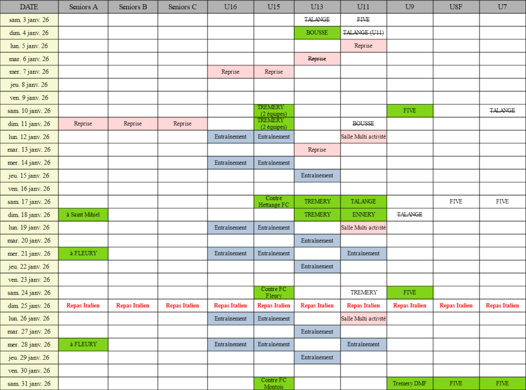 Planning prévisionnel du mois de Janvier 2026 ( en vert les plateaux confirmés)